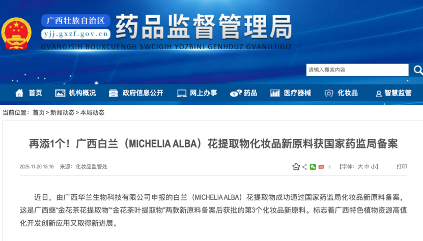 2025年,对于广西化妆品产业而言,是具有里程碑意义的年份。这一年,继广西和桂集团有限公司自主研发的“金花茶花提取物”“金花茶叶提取物”成为广西首例通过国家药监局备案的化妆品新原料后,广西华兰生物科技有限公司申报的“白兰(MICHELIA ALBA)花提取物”也成功获批。三款特色植物化妆品新原料的接连问世,彻底填补了广西在该领域的空白,标志着这片拥有7000多种植物资源的沃土,在“美丽经济”的版图上终于刻上了自己的名字。