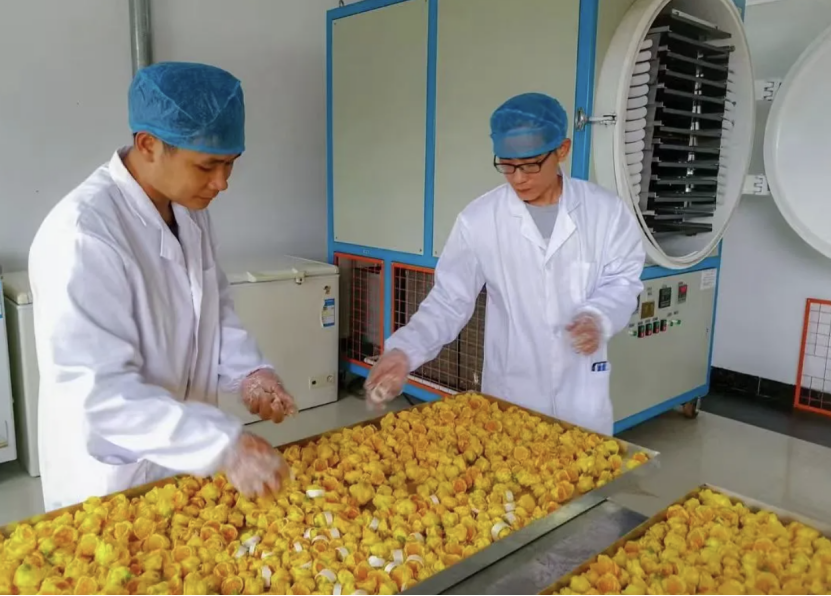 ↑技术专家对金花茶花进行冻干前分拣除杂