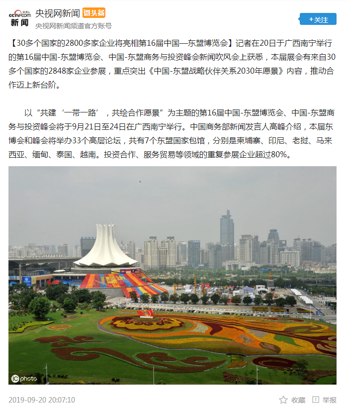 以“共建‘一带一路’,共绘合作愿景”为主题的第16届中国-东盟博览会、中国-东盟商务与投资峰会将于9月21日至24日在广西南宁举行。中国商务部新闻发言人高峰介绍,本届东博会和峰会将举办33个高层论坛,共有7个东盟国家包馆,分别是柬埔寨、印尼、老挝、马来西亚、缅甸、泰国、越南。投资合作、服务贸易等领域的重复参展企业超过80%。